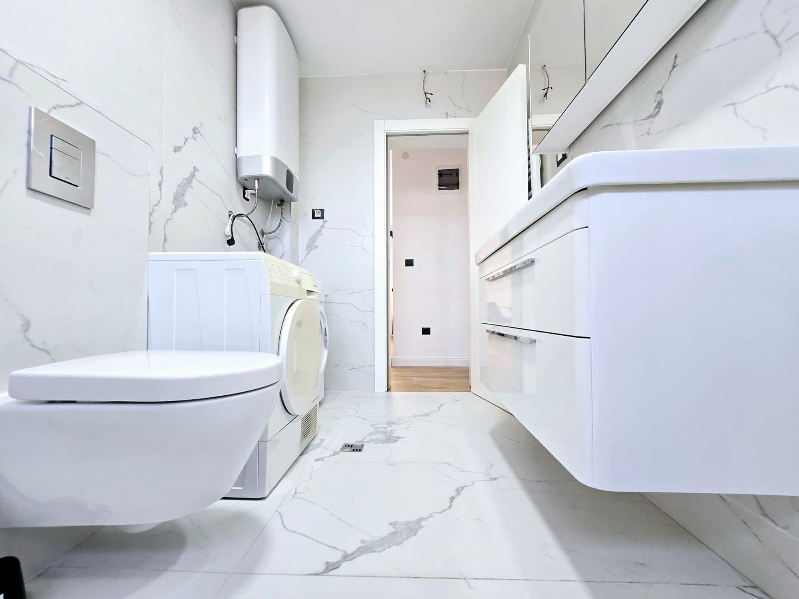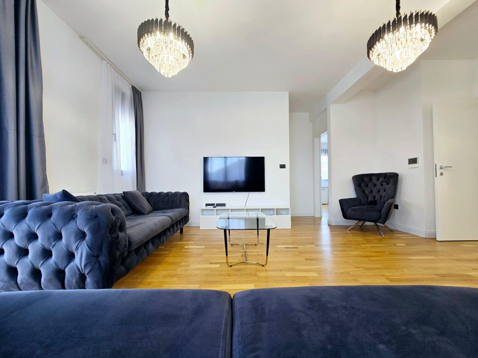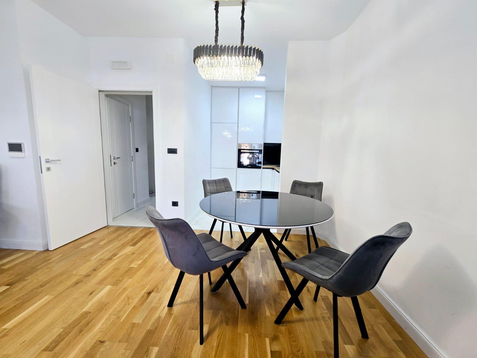Izdaje se namješten i luksuzno opremljen trosoban stan površine 140 m² u Tološima, Podgorica. Nalazi se na trećem spratu moderne stambene zgrade.